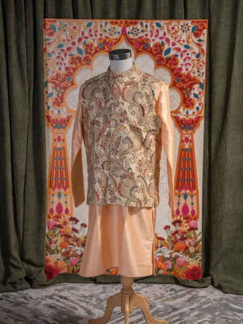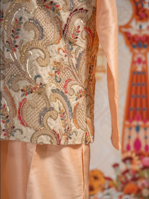 Ivory paisley Nehru jacket with detailed resham embroidery and hand beading, paired with a champagne kurta—perfect for elegant weddings and festive occasions.