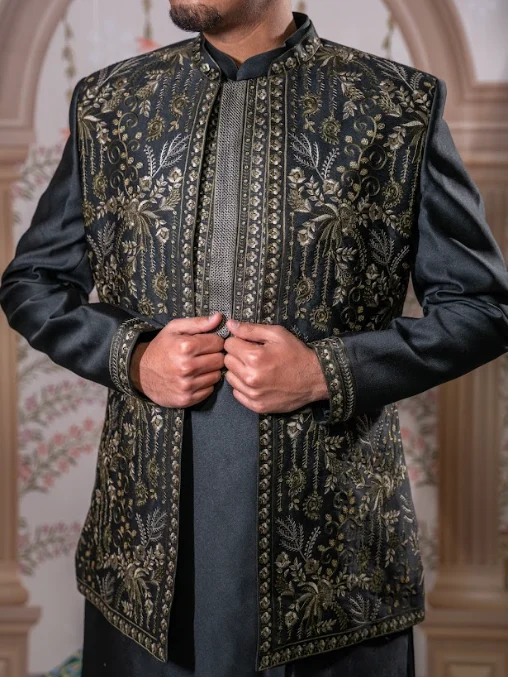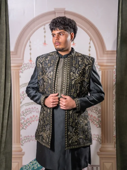 Dark forest green kurta set with antique gold thread embroidered vest, featuring royal Mughal motifs, perfect for weddings and receptions