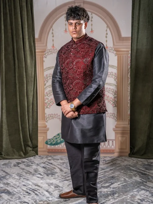 Elegant black kurta paired with richly embroidered crimson paisley waistcoat, blending traditional craftsmanship with modern luxury—perfect for weddings, receptions, and festive celebrations.