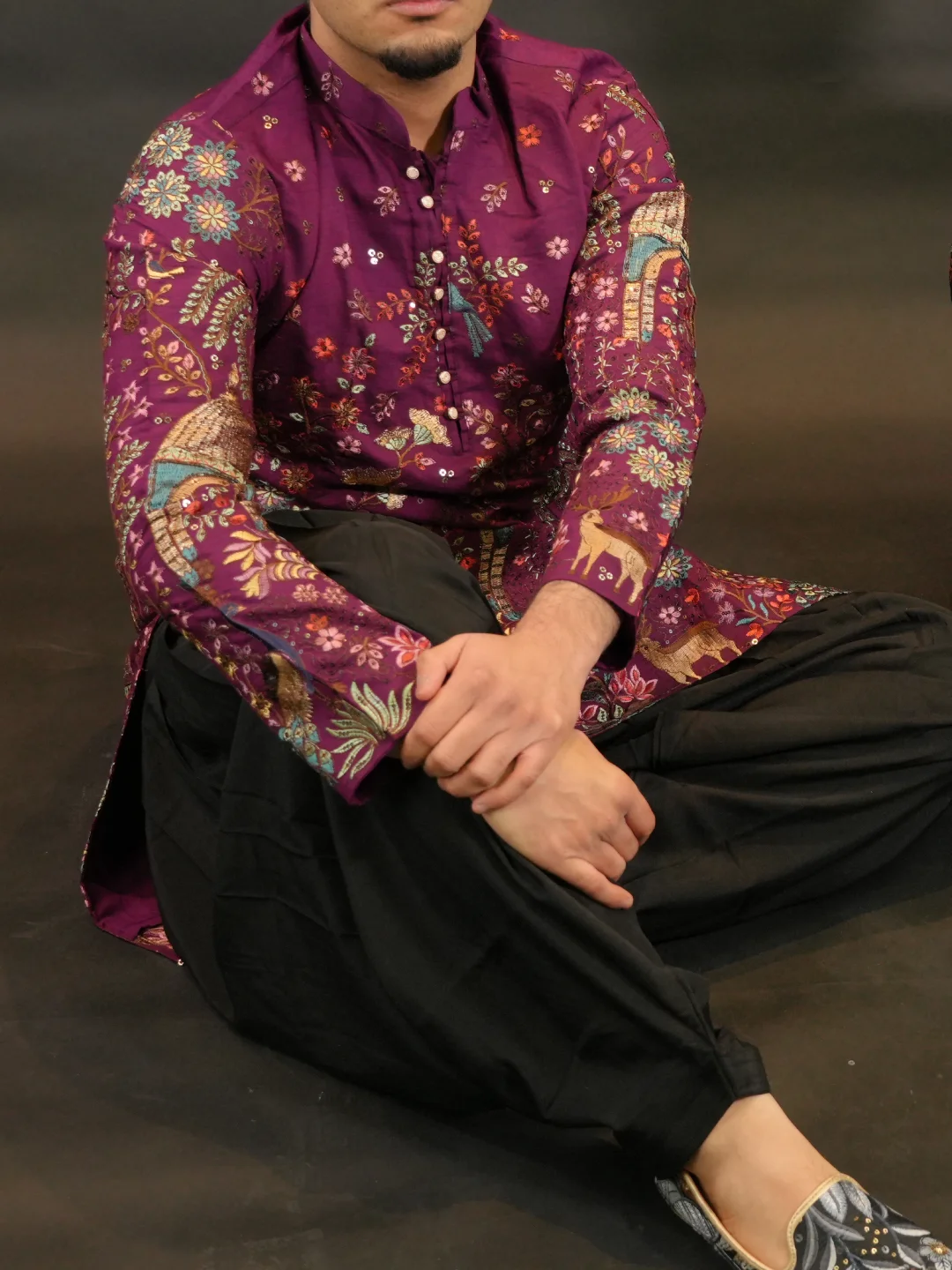 Men’s kurta salwar featuring heavy border embroidery and delicate embroidery on the front and back, designed with a mandarin collar and paired with matching salwar..
