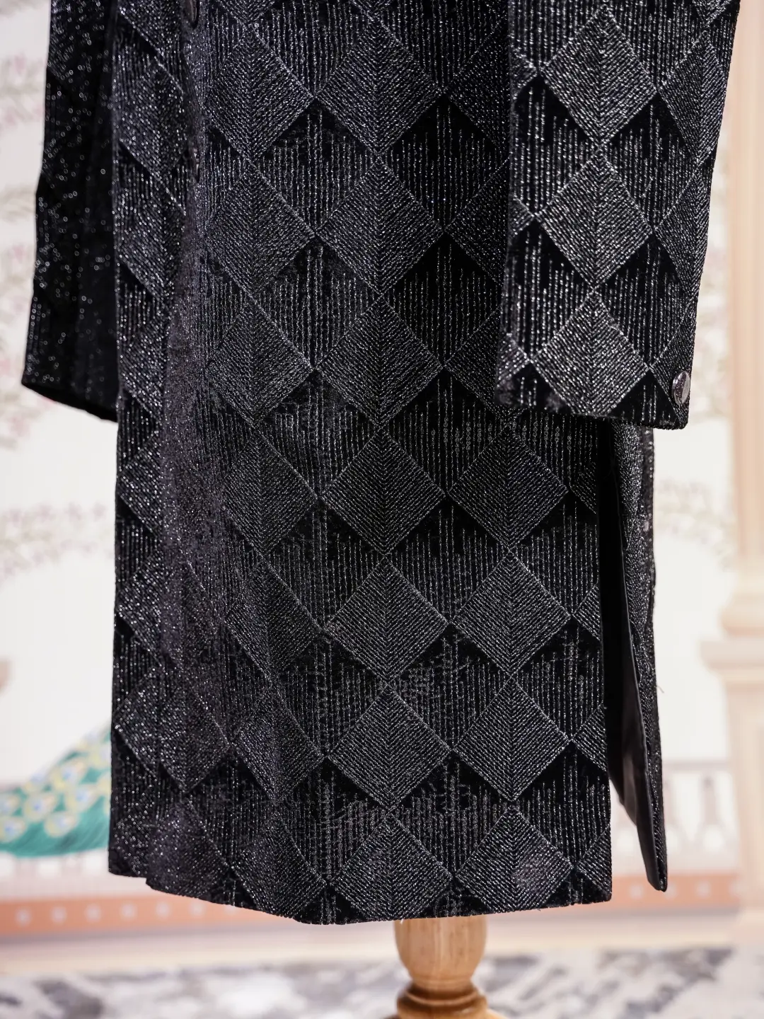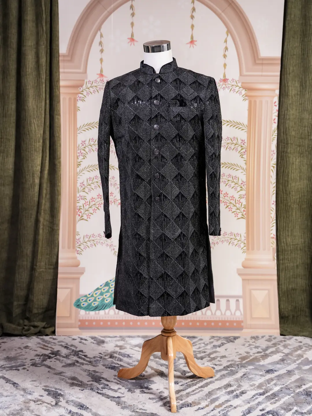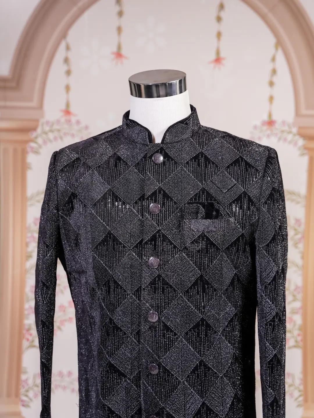 A statement black sherwani featuring layered geometric panel detailing with subtle shimmer,designed for grooms and formal evening occasions.