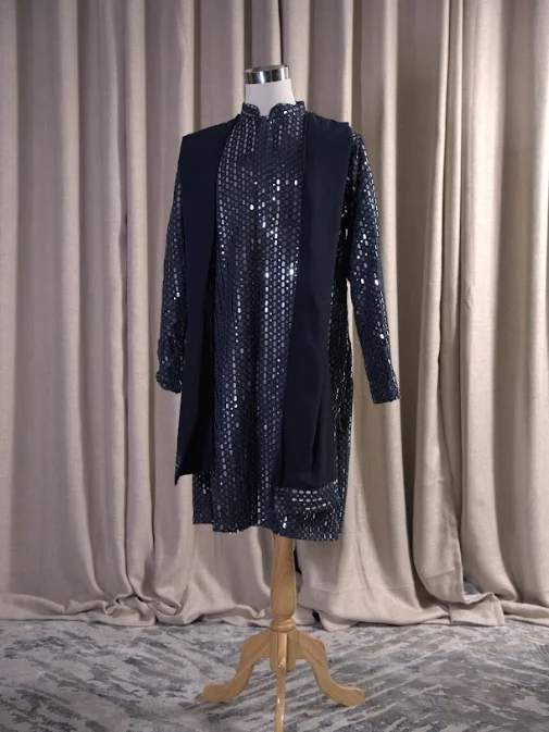 Midnight navy kurta set with geometric mirror foil work, layered with sleek jacket, offering a modern, elegant, and festive Indo-Western look.