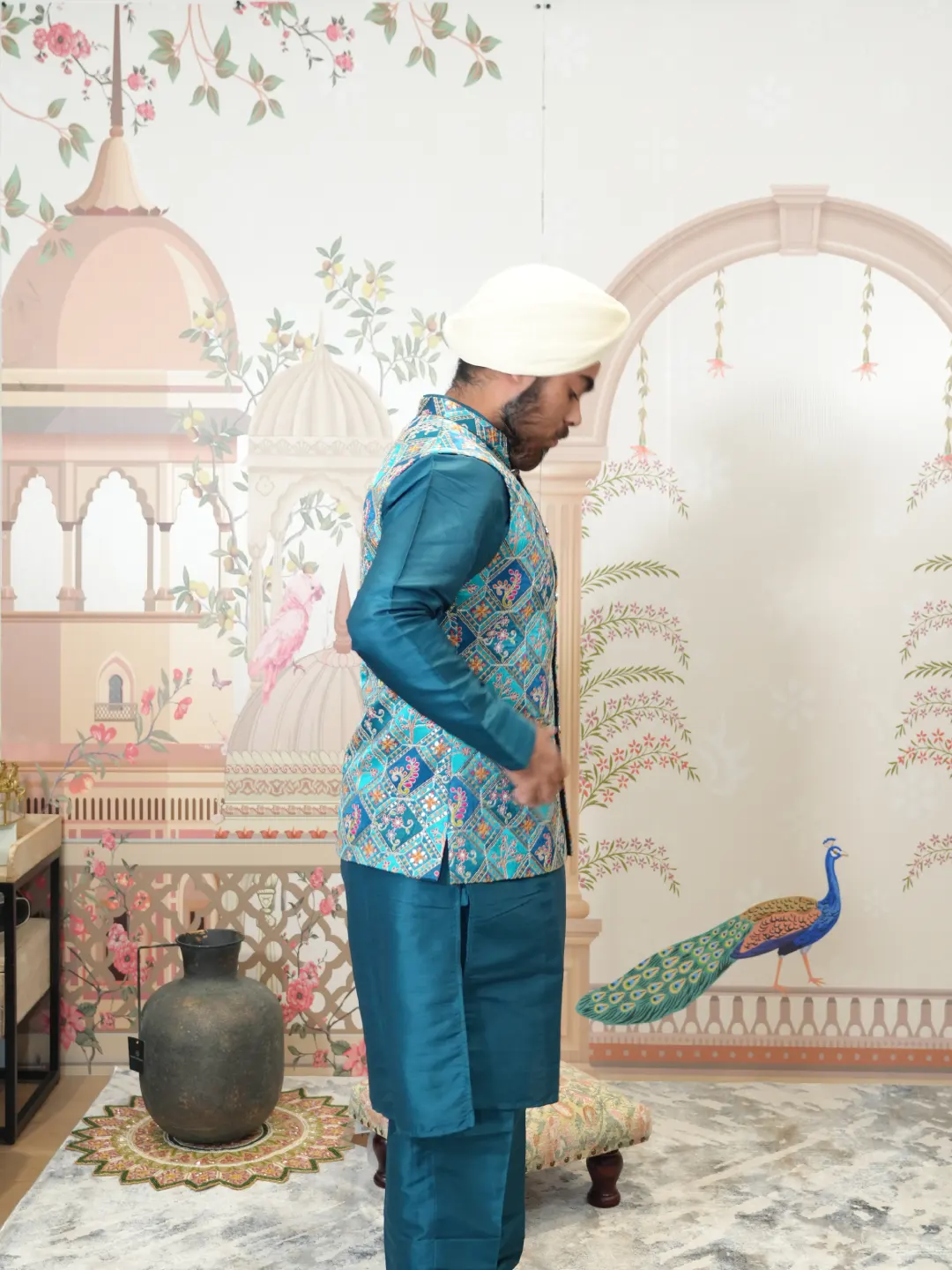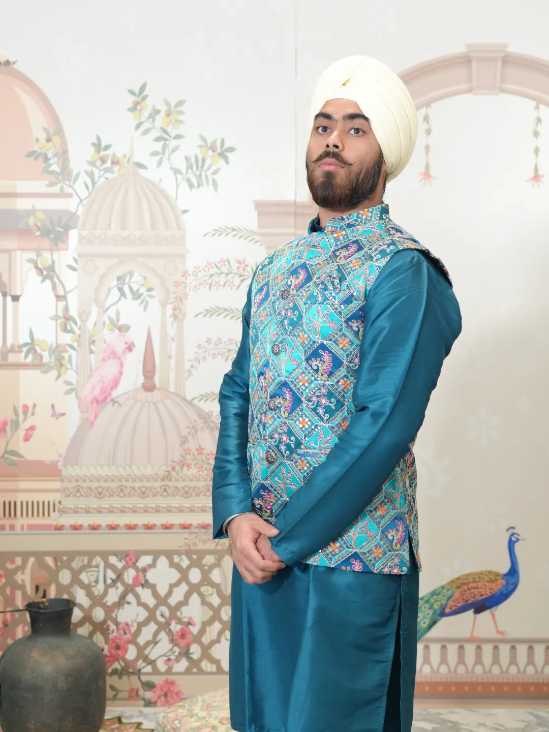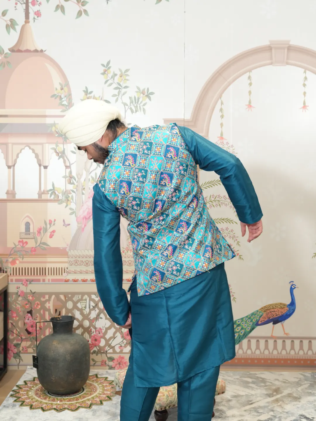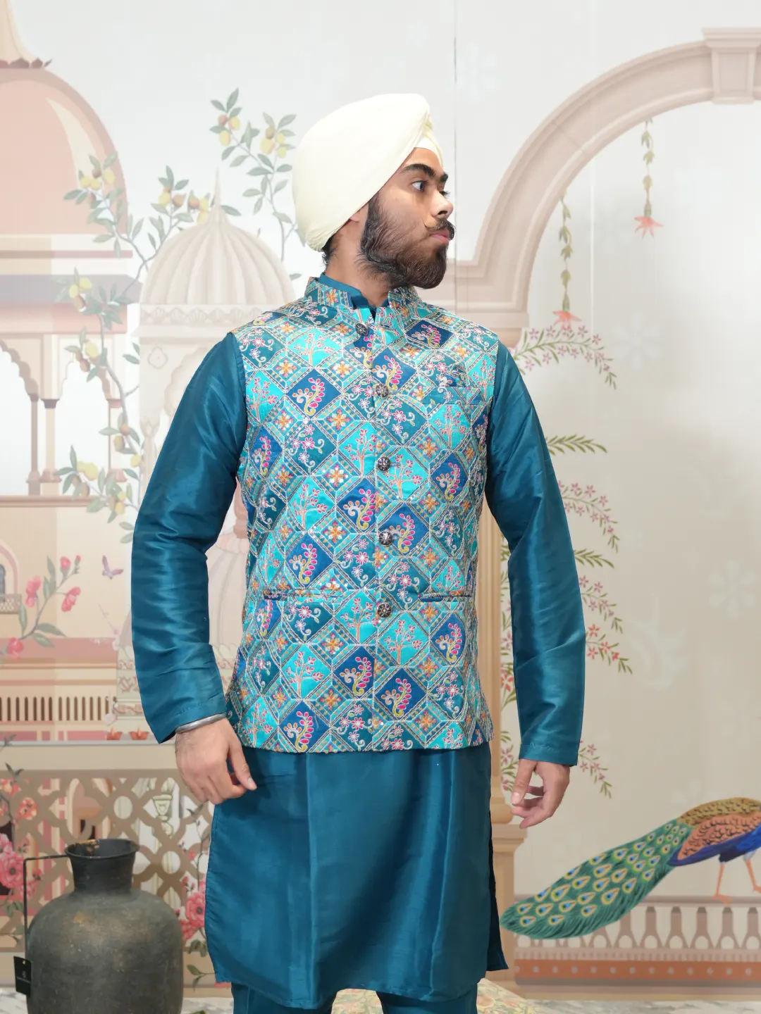 Elegant peacock green silk kurta pajama for men, complemented by a beautifully embroidered waistcoat adorned with intricate sequin detailing