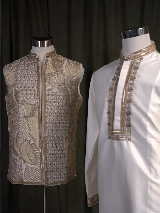 Elegant ivory kurta paired with a heavily embroidered vest featuring cutdana, nalpi, and zari work for a luxurious wedding look