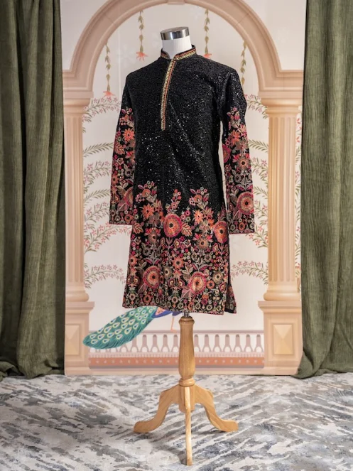Luxury black velvet kurta with vibrant multicolor floral embroidery, detailed sleeves, and rich festive appeal—perfect for weddings and statement occasions