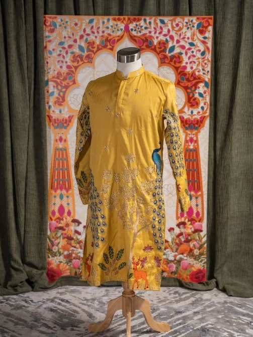 Haldi yellow silk kurta with peacock embroidery, resham thread work, and elegant detailing—perfect for weddings, haldi, and festive occasions