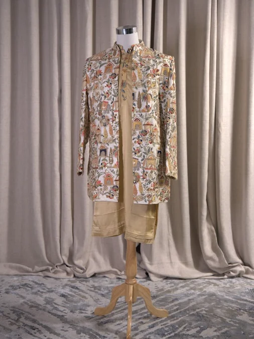 Ivory Indo-Western with Mughal-inspired scenic prints, paired with a golden kurta. Elegant, artistic, and perfect for weddings or festive celebrations